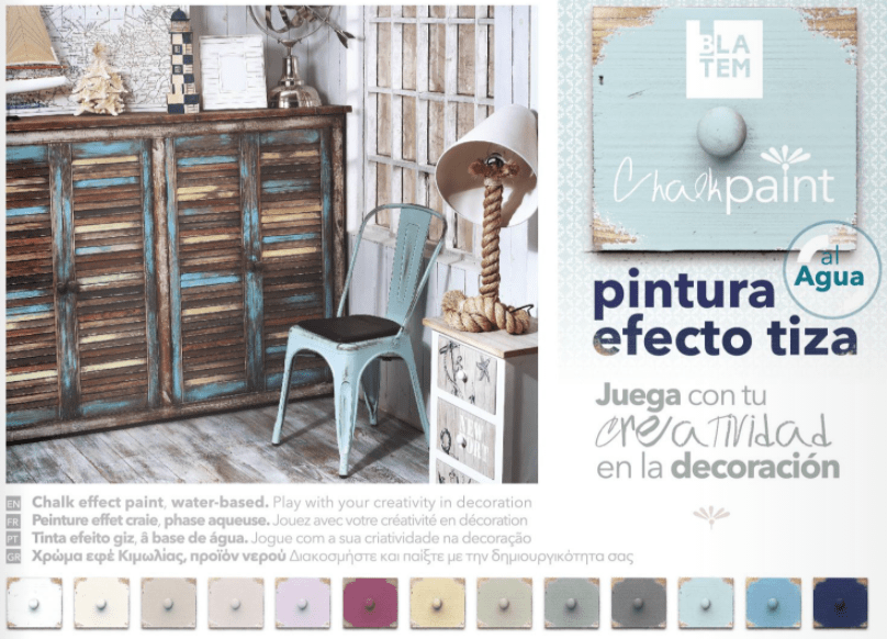Pinta i decora amb Chalk Paint de BLATEM. Pintura a l’aigua que donarà un efecte guix als teus mobles i objectes d’interior, amb acabat mat. Resistent a les humitats i al temps. Molt fàcil d’aplicar, còmode i divertit!