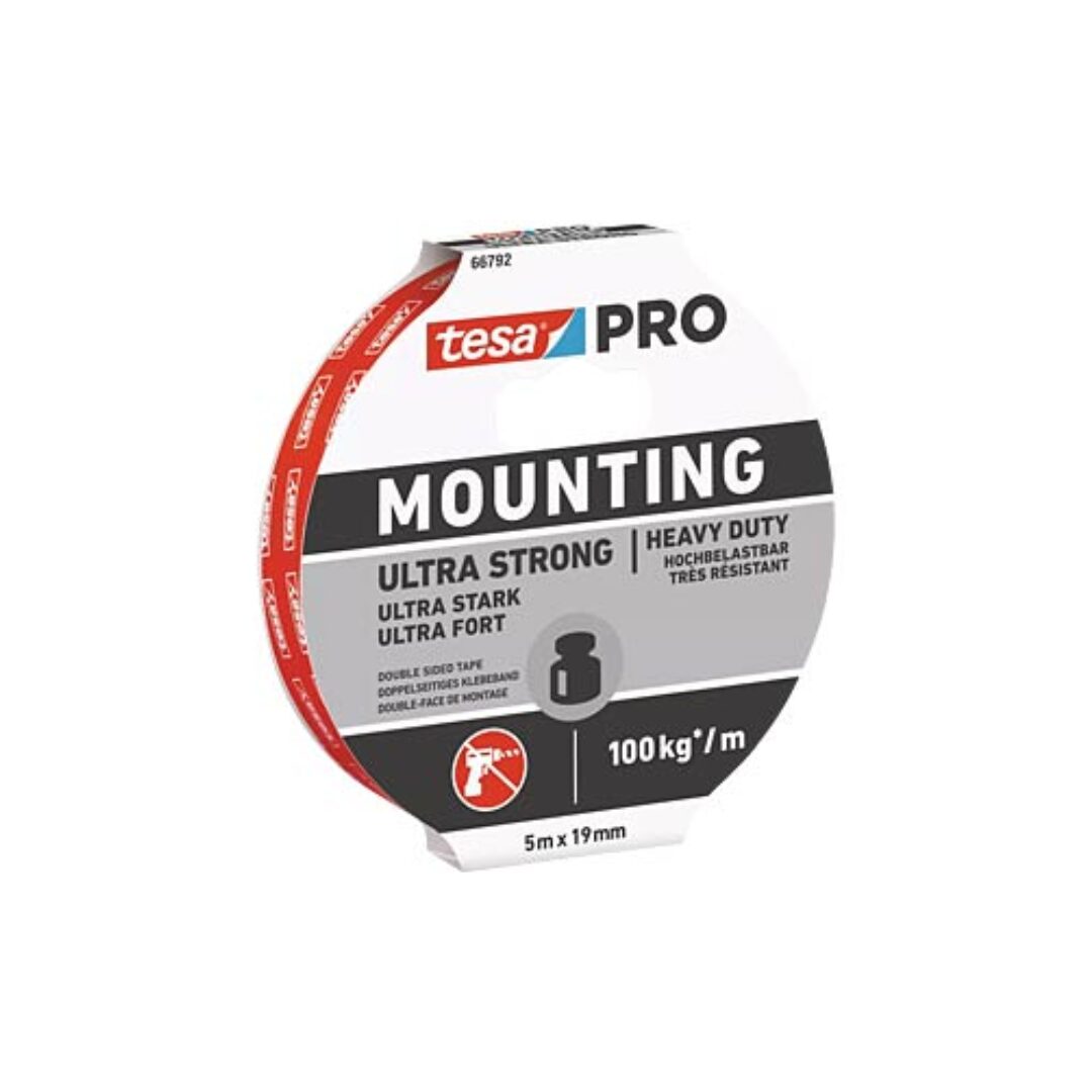 a tesa® PRO 66792 Mounting Ultra Strong es la cinta de montaje más resistente de tesa, diseñada para la fijación segura y permanente de objetos pesados sin necesidad de tornillos, tacos ni clavos. Su adhesivo ultra fuerte es capaz de soportar hasta 10 kg por cada 10 cm de cinta, ofreciendo una solución rápida y eficaz sin tiempos de espera.